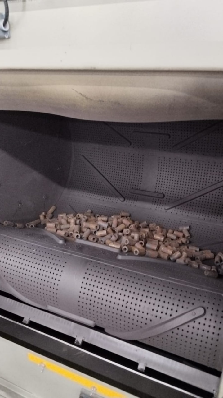 Мастера выбирают крупную колотую стальную дробь с острыми краями, которая подрезает слой пластика и скалывает его с металла. Давление воздуха поднимают до максимальных 7–8 бар, скорость процесса при этом остается ниже. Часто детали предварительно нагревают в печи до +200℃. Это делает полимер хрупким и облегчает работу дробеструйной установки.